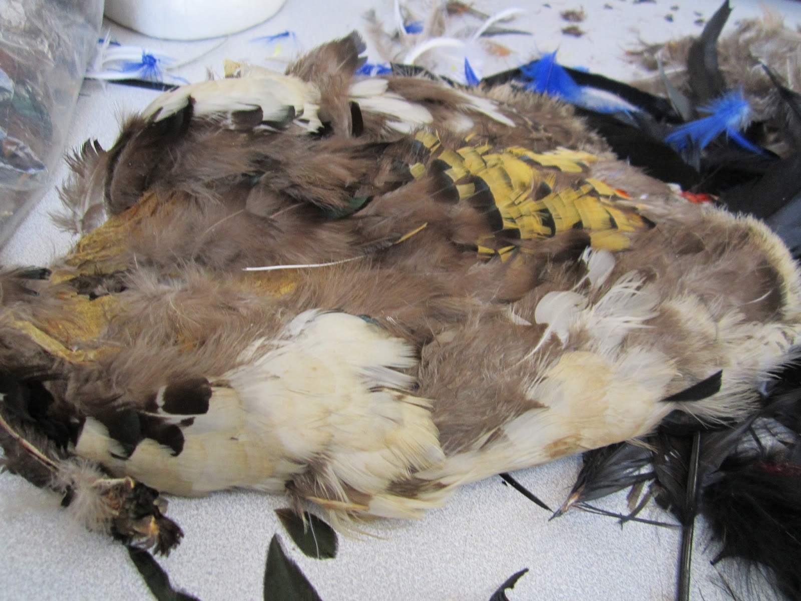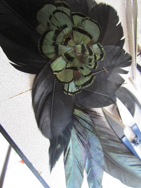 These are another few areas I have been learning skills in. Today we learned how to use feathers. I learned the characteristics of different feathers from various birds and was able to make an accessory with them! I chose to do a hand piece/braclet/corsage type thing. I used goose and pheasant feathers. I actually had to pluck the pheasant feathers from the leathery skin. It was disgusting and smelly.